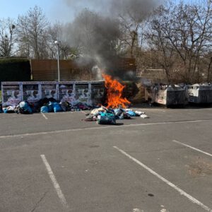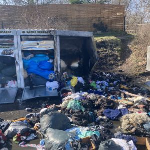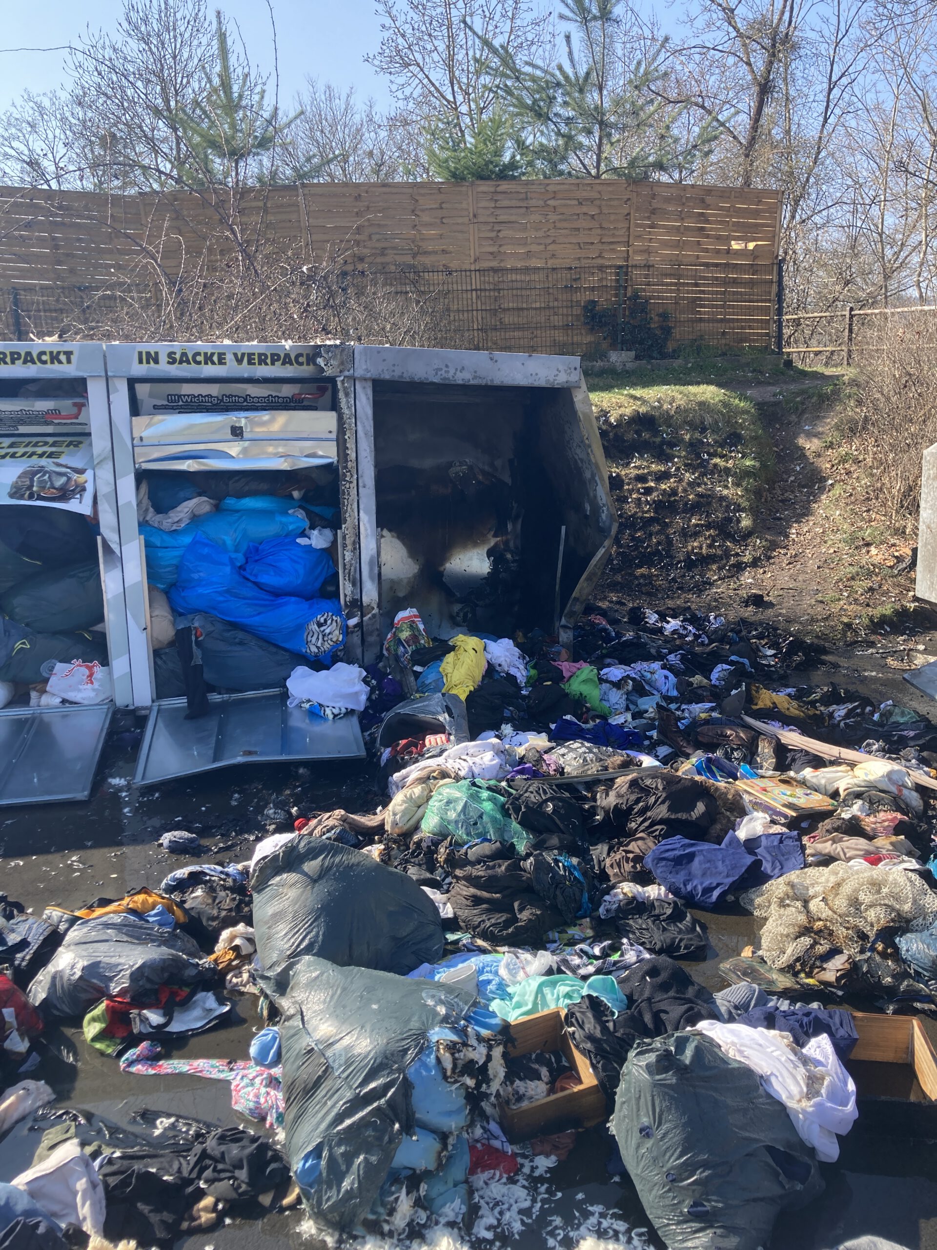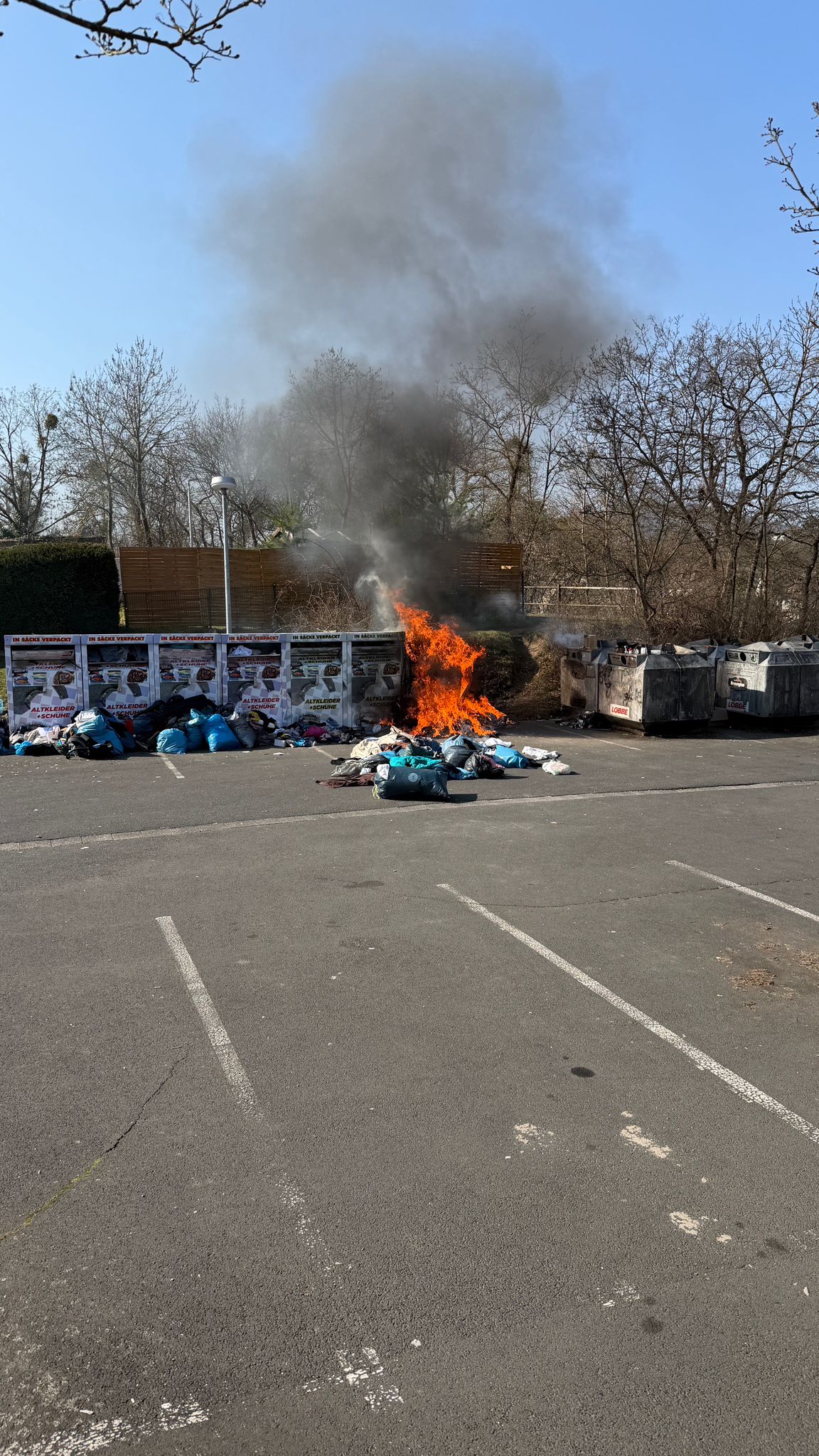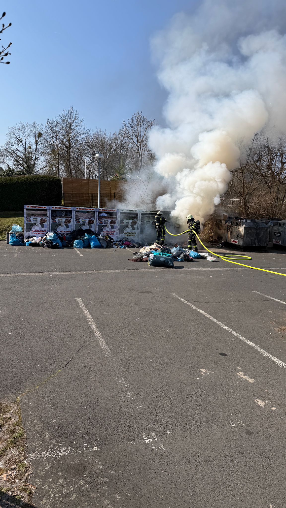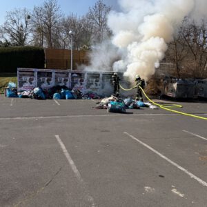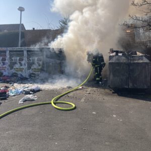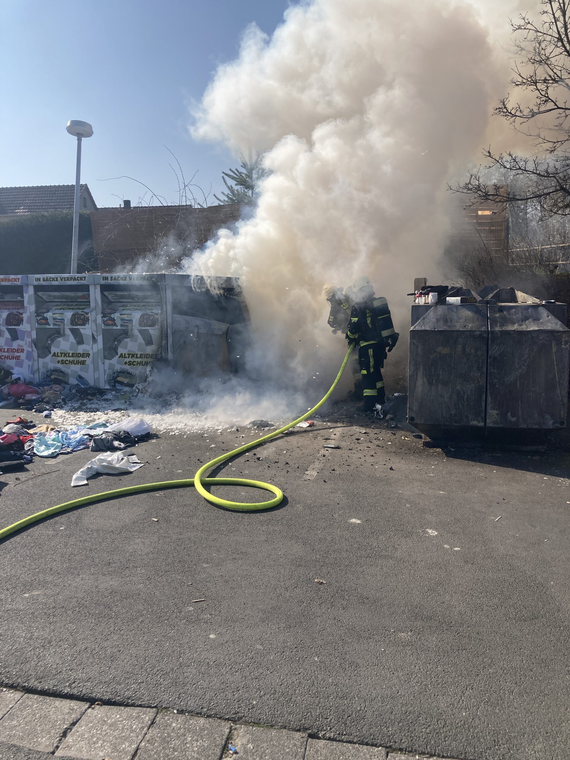 Am Sonntagvormittag wurde die Feuerwehr Bad Wildungen zu brennenden Altkleidercontainern alarmiert. Zur Brandbekämpfung ging ein Trupp unter Atemschutz mit einem C-Rohr vor.