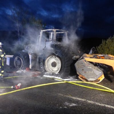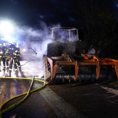 Bei Eintreffen der Einsatzkräfte an der Einsatzstelle stand das landwirtschaftliche Fahrzeug in Vollbrand. Unter Vornahme dreier C-Rohre gingen insgesamt drei Angriffstrupps zur Brandbekämpfung vor. Ebenso mussten auslaufender Dieselkraftstoff und Hydrauliköl aufgefangen und mit Ölbindemittel gebunden werden.