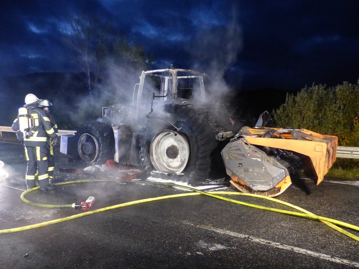 Bei Eintreffen der Einsatzkräfte an der Einsatzstelle stand das landwirtschaftliche Fahrzeug in Vollbrand. Unter Vornahme dreier C-Rohre gingen insgesamt drei Angriffstrupps zur Brandbekämpfung vor. Ebenso mussten auslaufender Dieselkraftstoff und Hydrauliköl aufgefangen und mit Ölbindemittel gebunden werden.