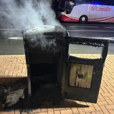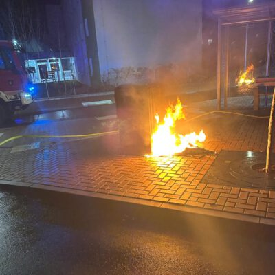 Ein auf dem Parkplatz „Brunnenallee 1“ brennender Mülleimer wurde unter Vornahme eines C-Rohres von einem Atemschutztrupp gelöscht.