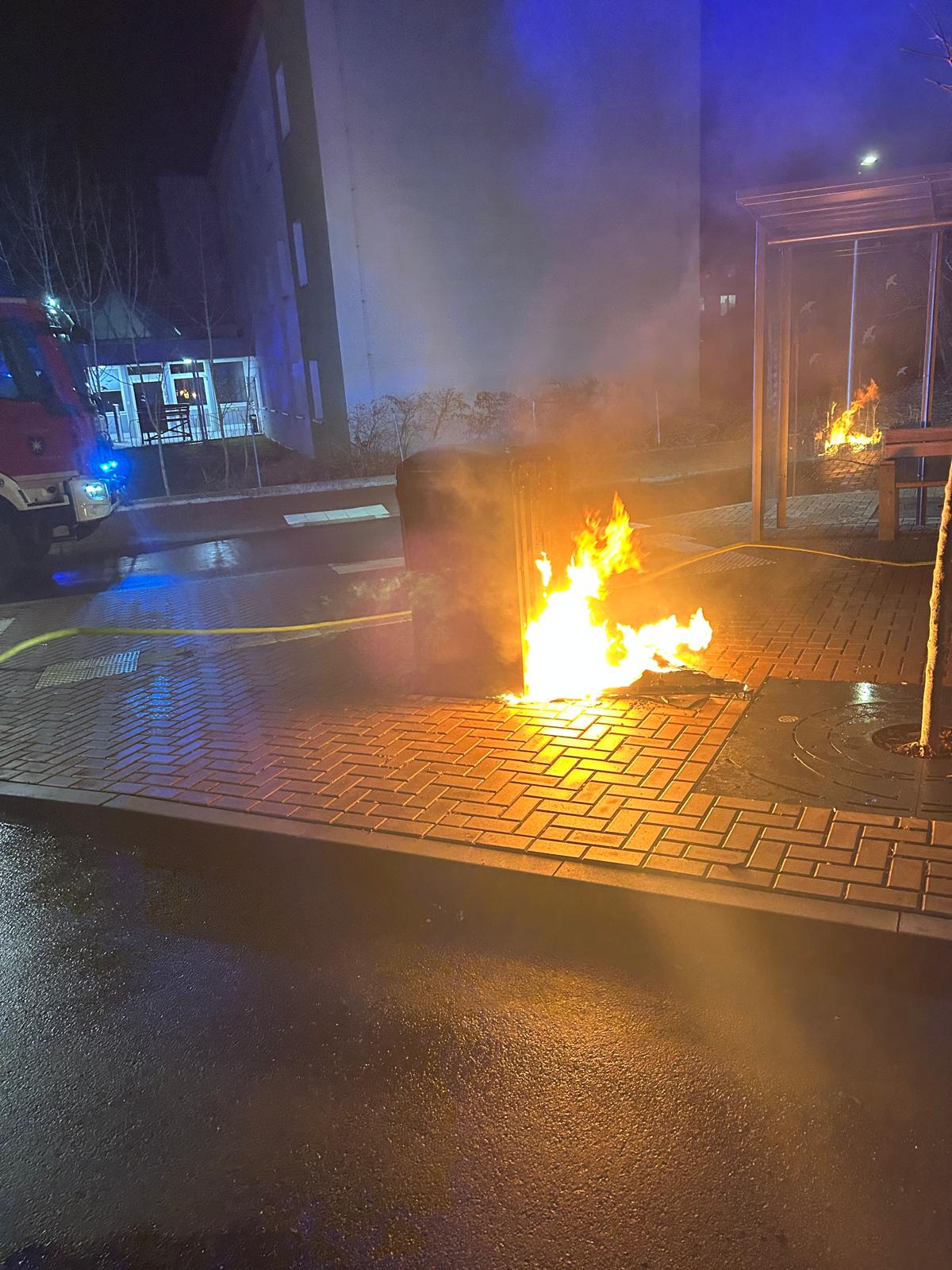 Mittwoch, 31. Dezember, 20:42 Uhr, Bad Wildungen, Brunnenallee, Parkplatz, F 1 – brennt Mülleimer.