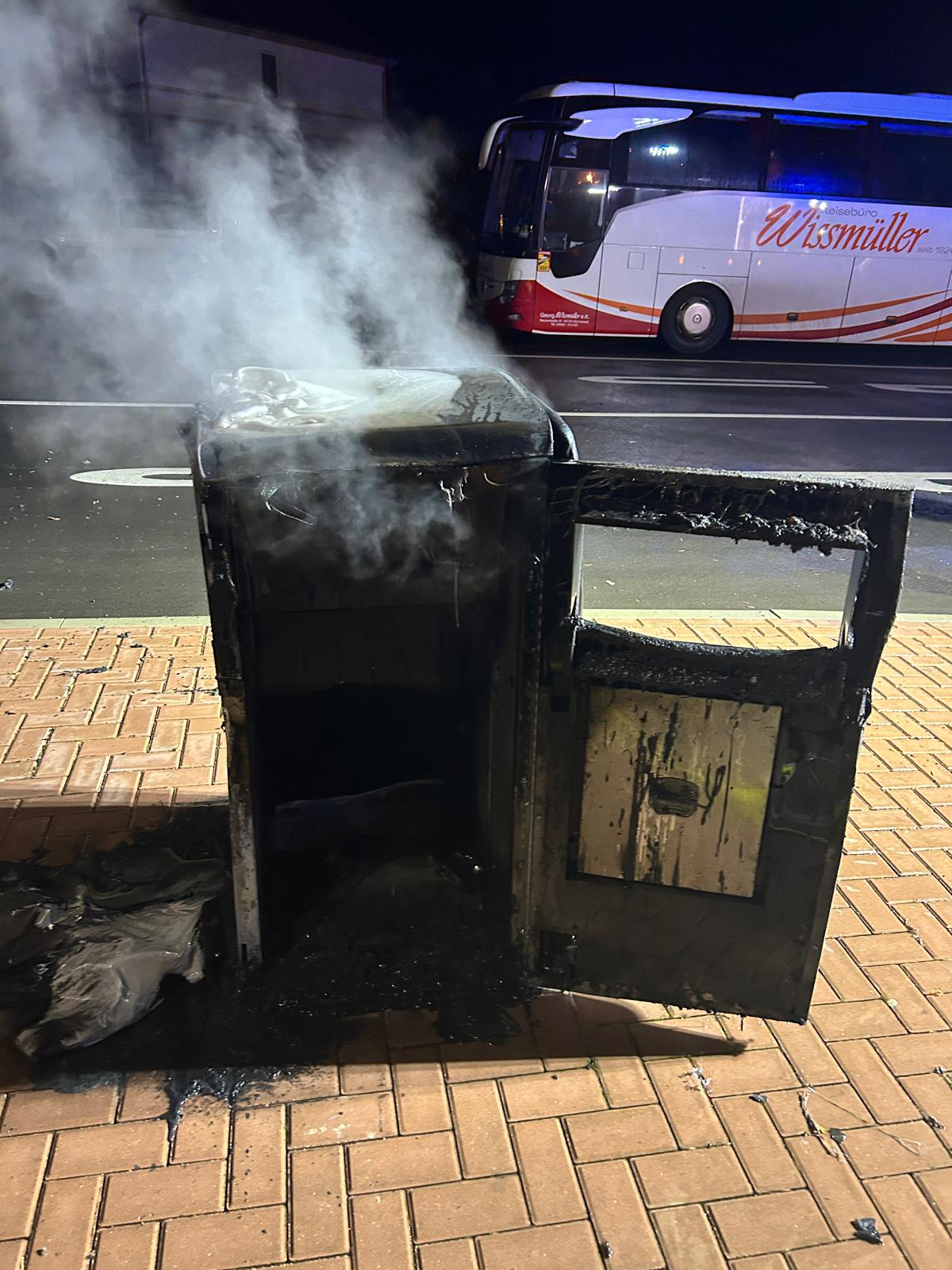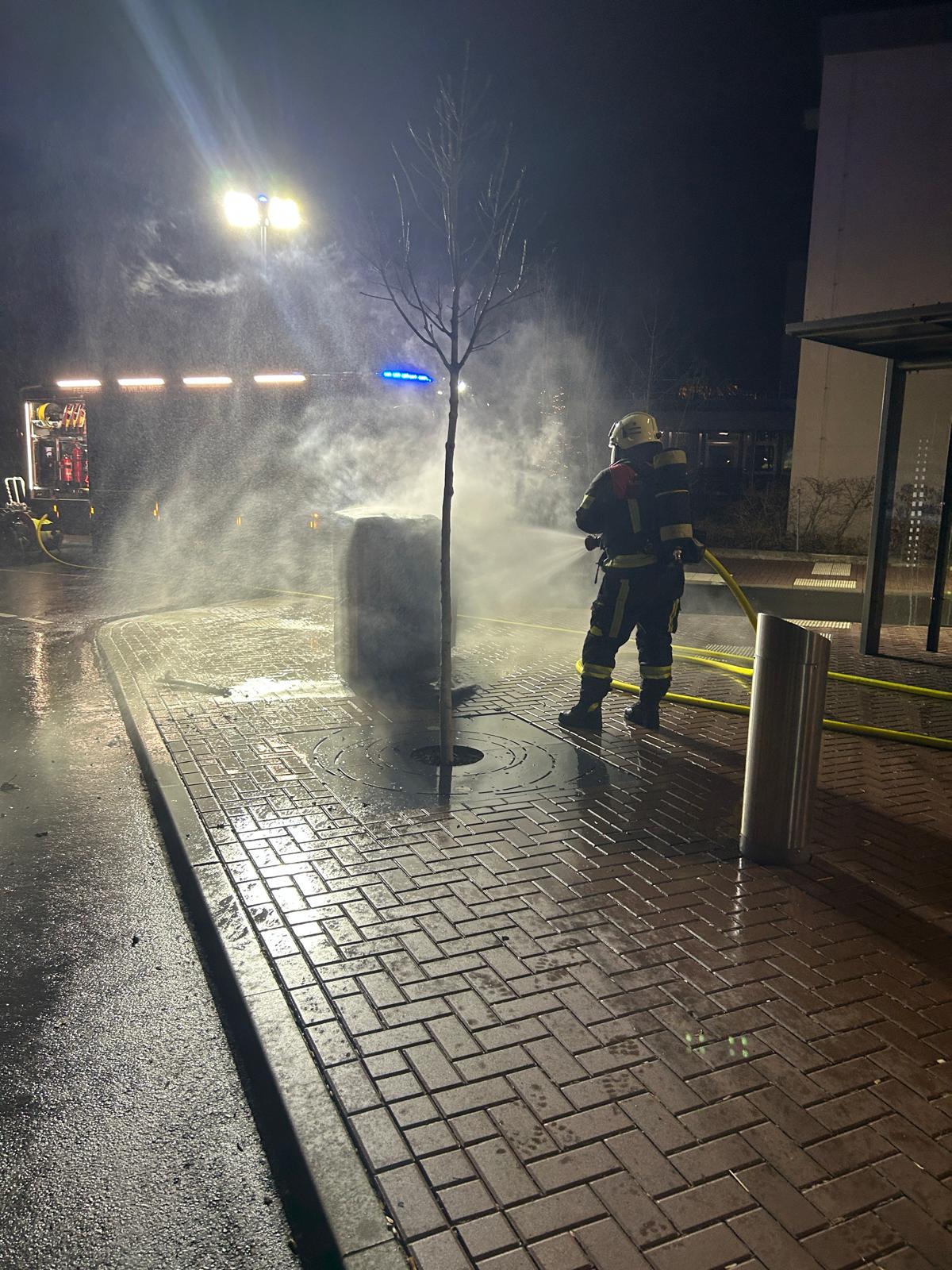 Ein auf dem Parkplatz „Brunnenallee 1“ brennender Mülleimer wurde unter Vornahme eines C-Rohres von einem Atemschutztrupp gelöscht.