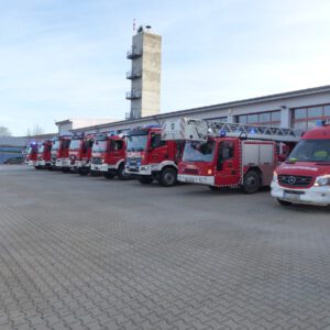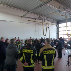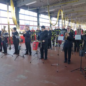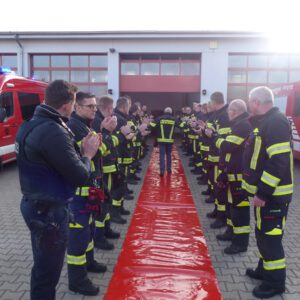 Nachdem Udo Paul von der Wehrführung und Stadtbrandinspektor Alexander Paul von seiner Geburtstagsfeier abgeholt wurde, geleiteten ihn die Kameraden der Einsatzabteilung durch ein Spalier in die Fahrzeughalle, wo der Musikzug bereits mit einem Geburtstagsständchen aufwartete.