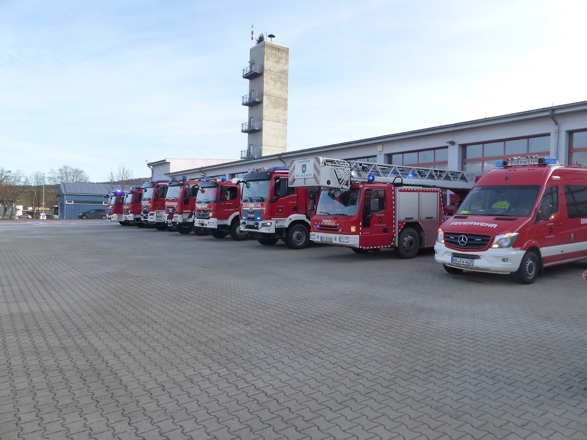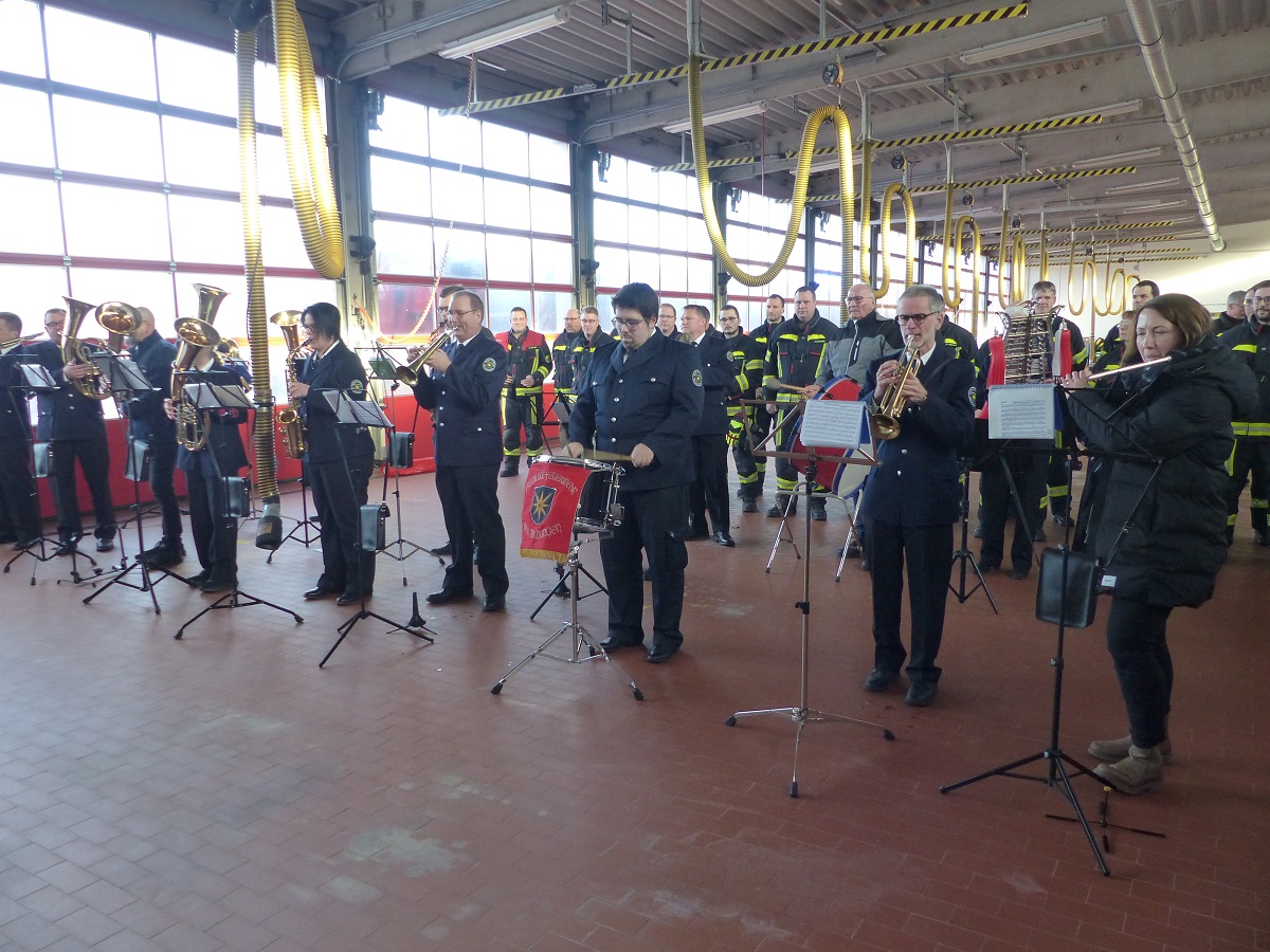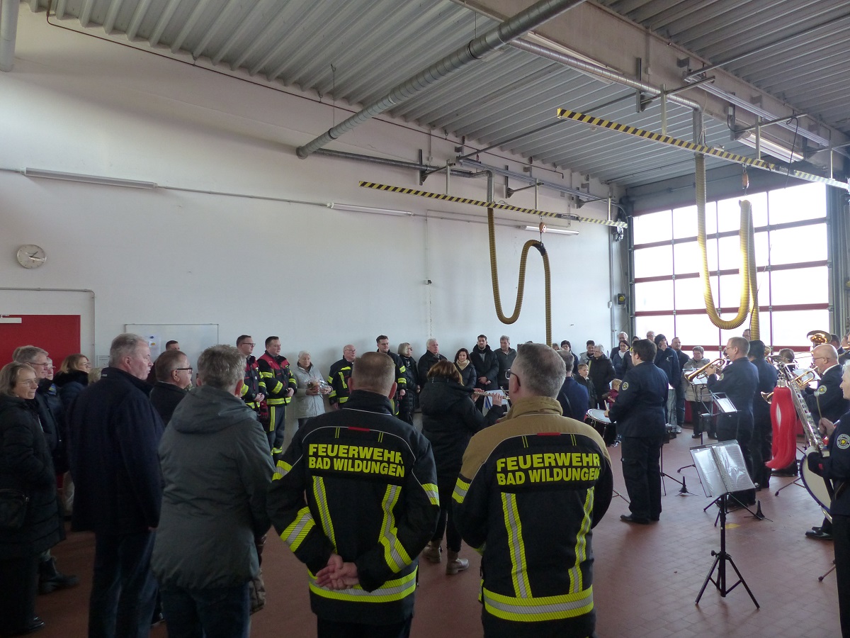 Nachdem Udo Paul von der Wehrführung und Stadtbrandinspektor Alexander Paul von seiner Geburtstagsfeier abgeholt wurde, geleiteten ihn die Kameraden der Einsatzabteilung durch ein Spalier in die Fahrzeughalle, wo der Musikzug bereits mit einem Geburtstagsständchen aufwartete.
