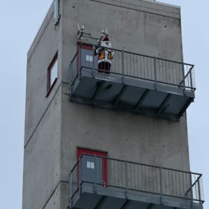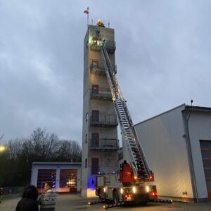 Da der auf dem Schlauchturm gestrandet war, musste er mit Drehleiter gerettet und auf den Boden gebracht werden.